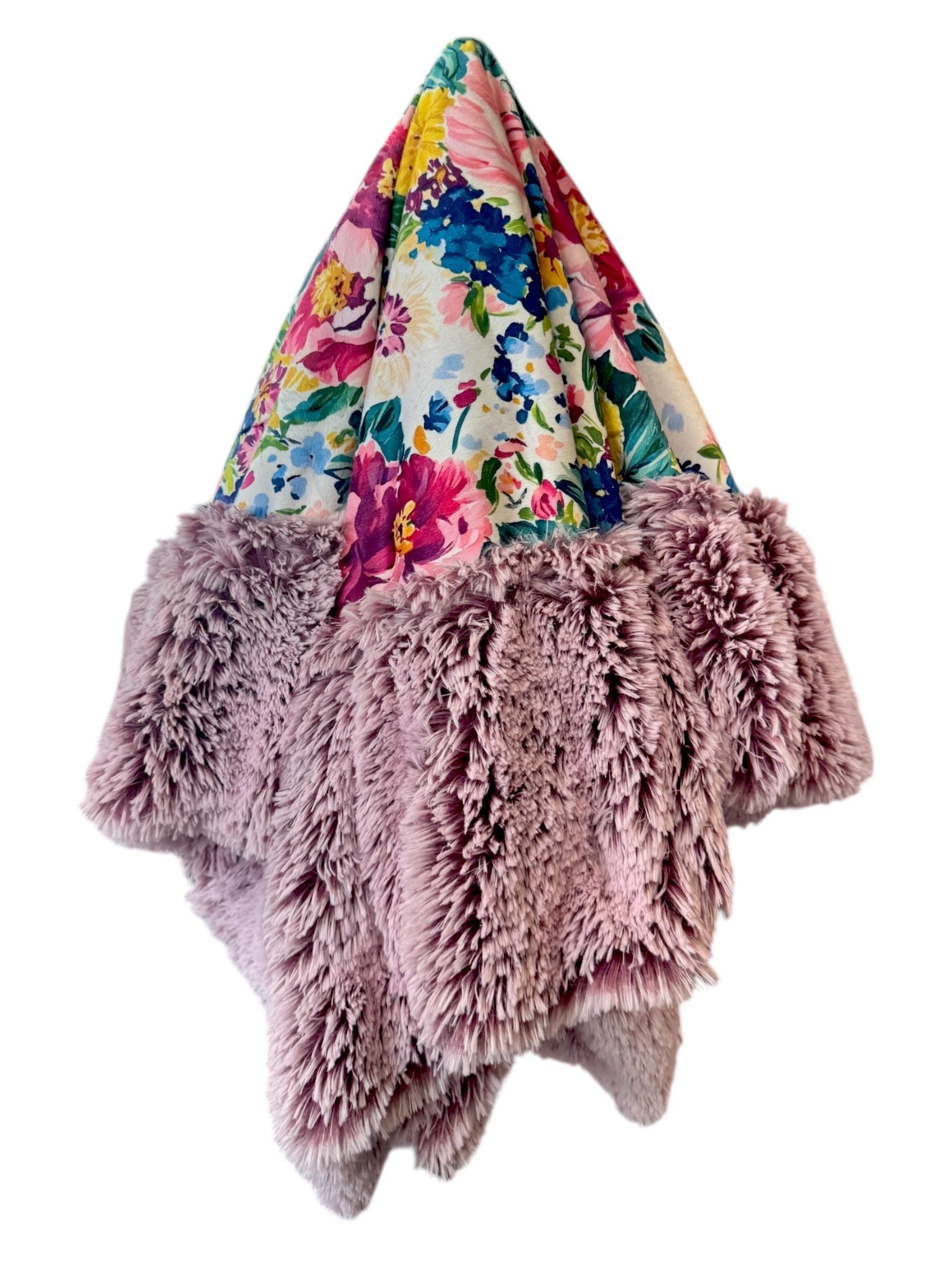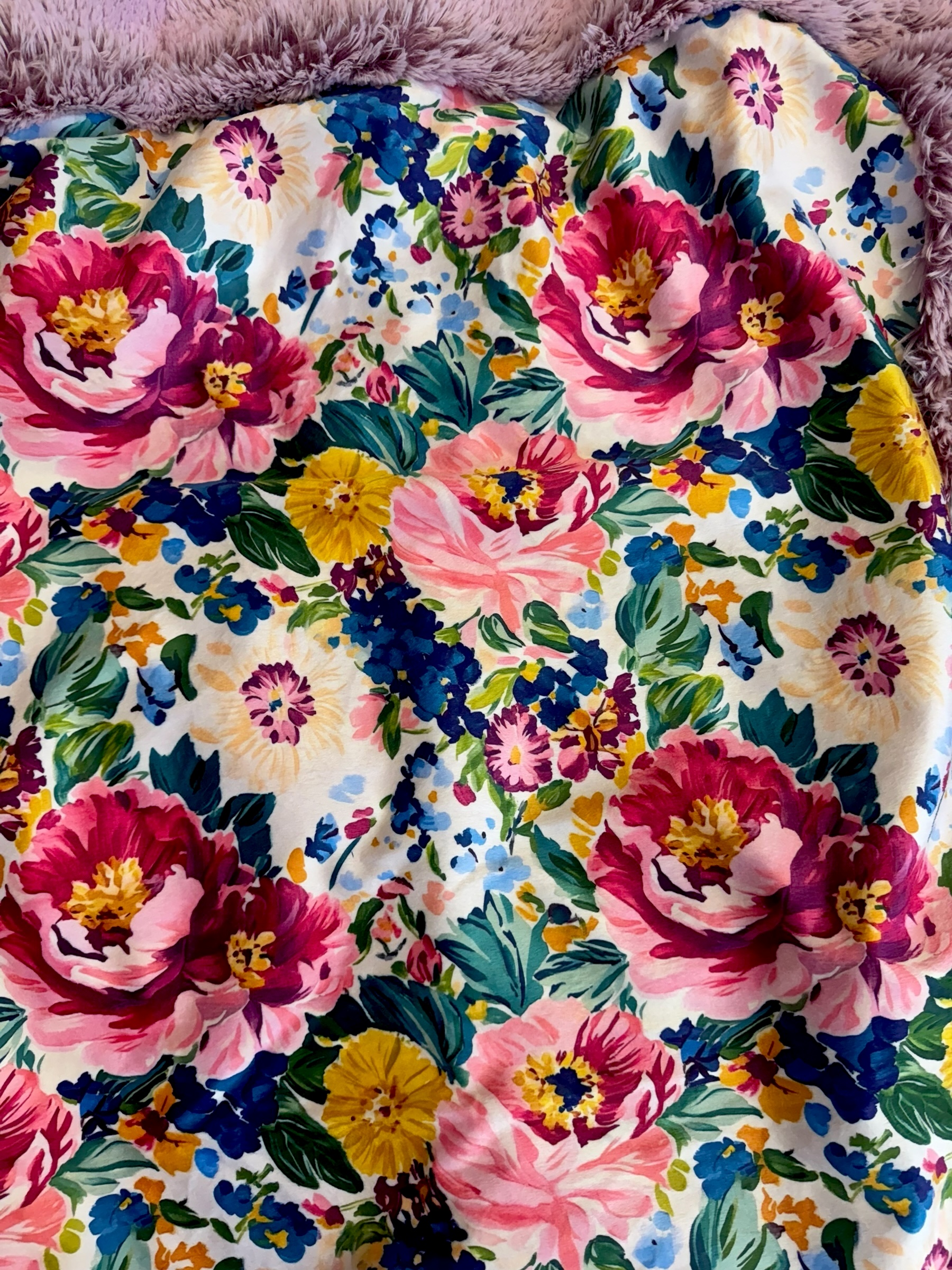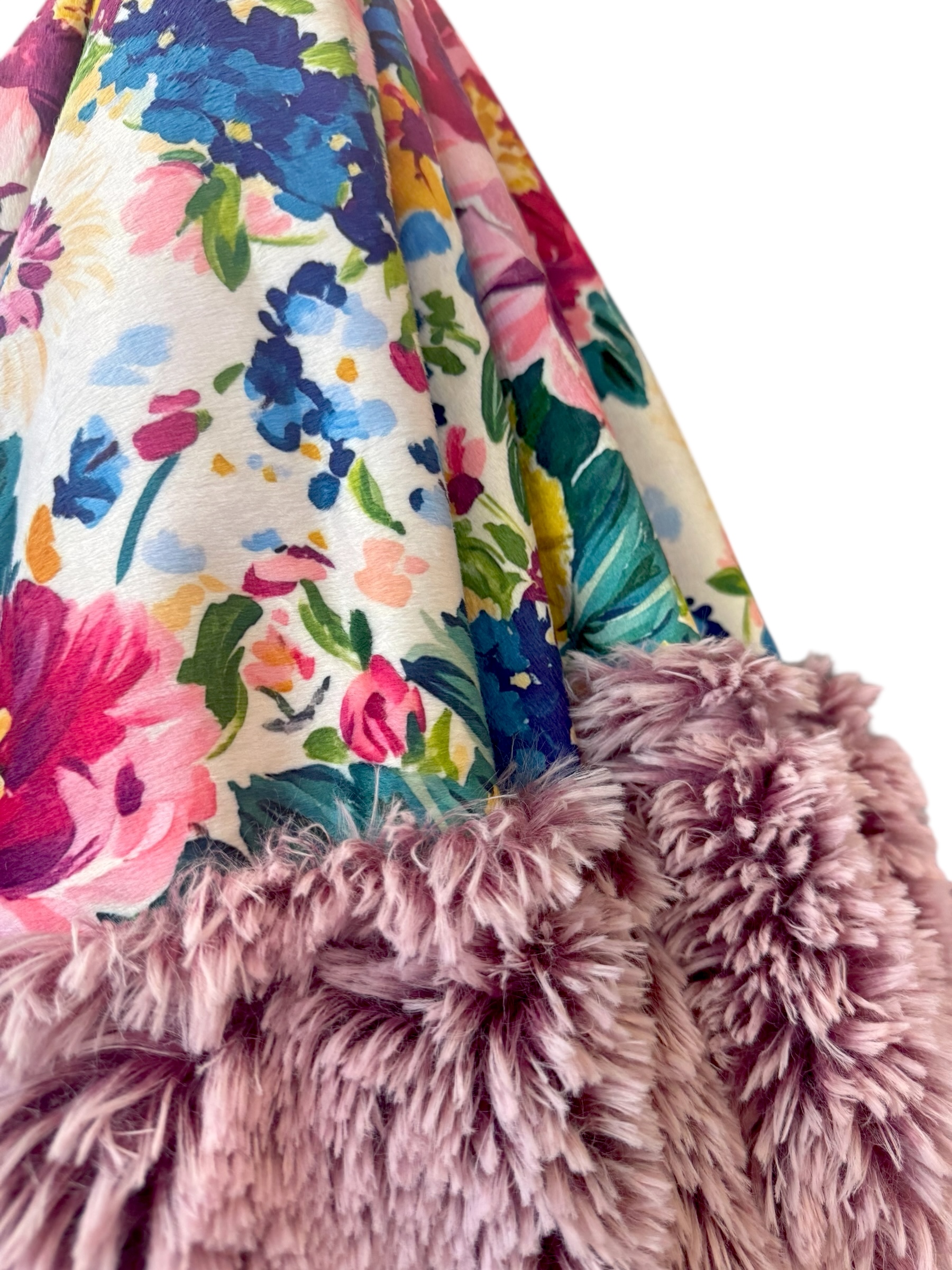 Beautiful large colorful floral print on luxe fluffy rosewood shag